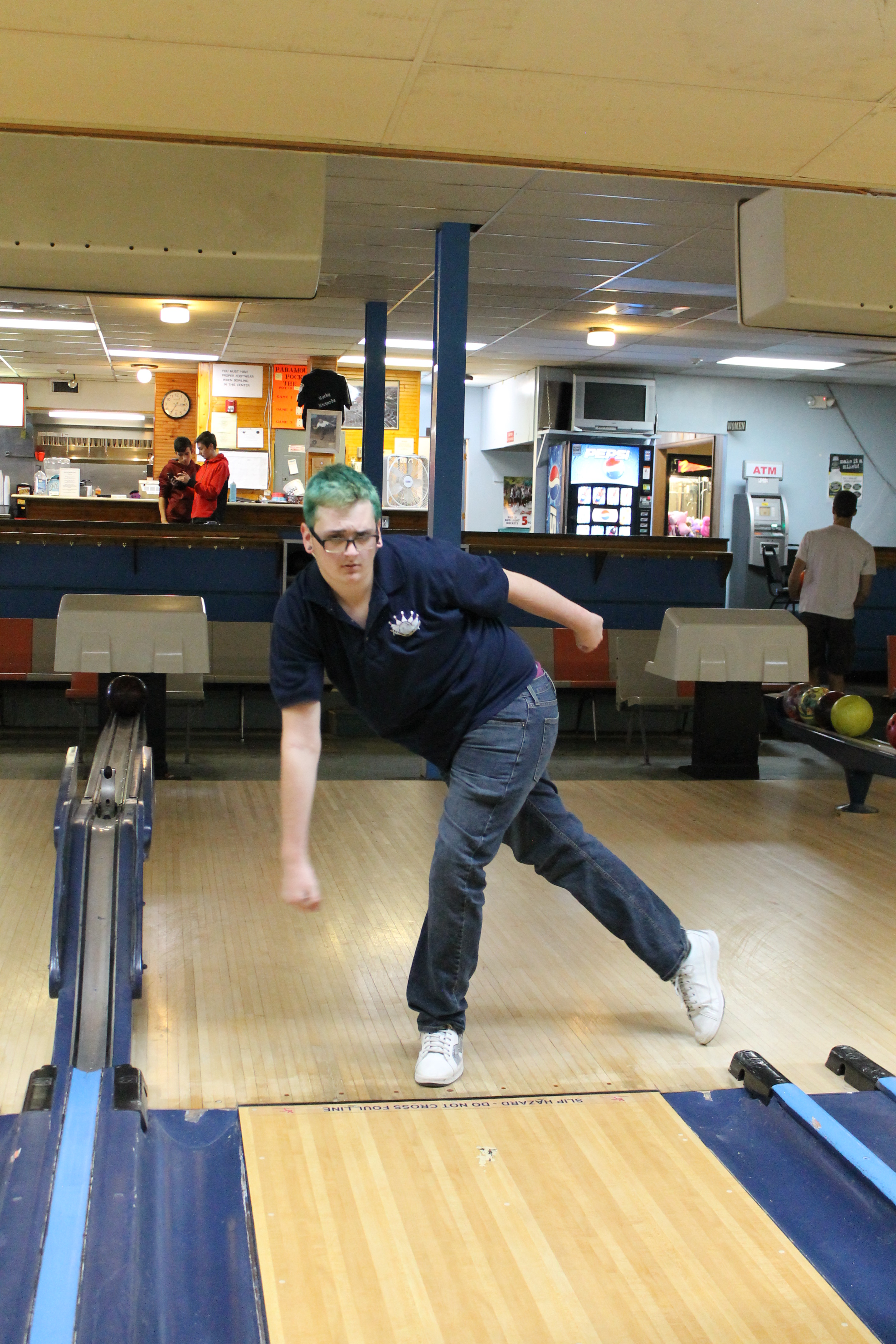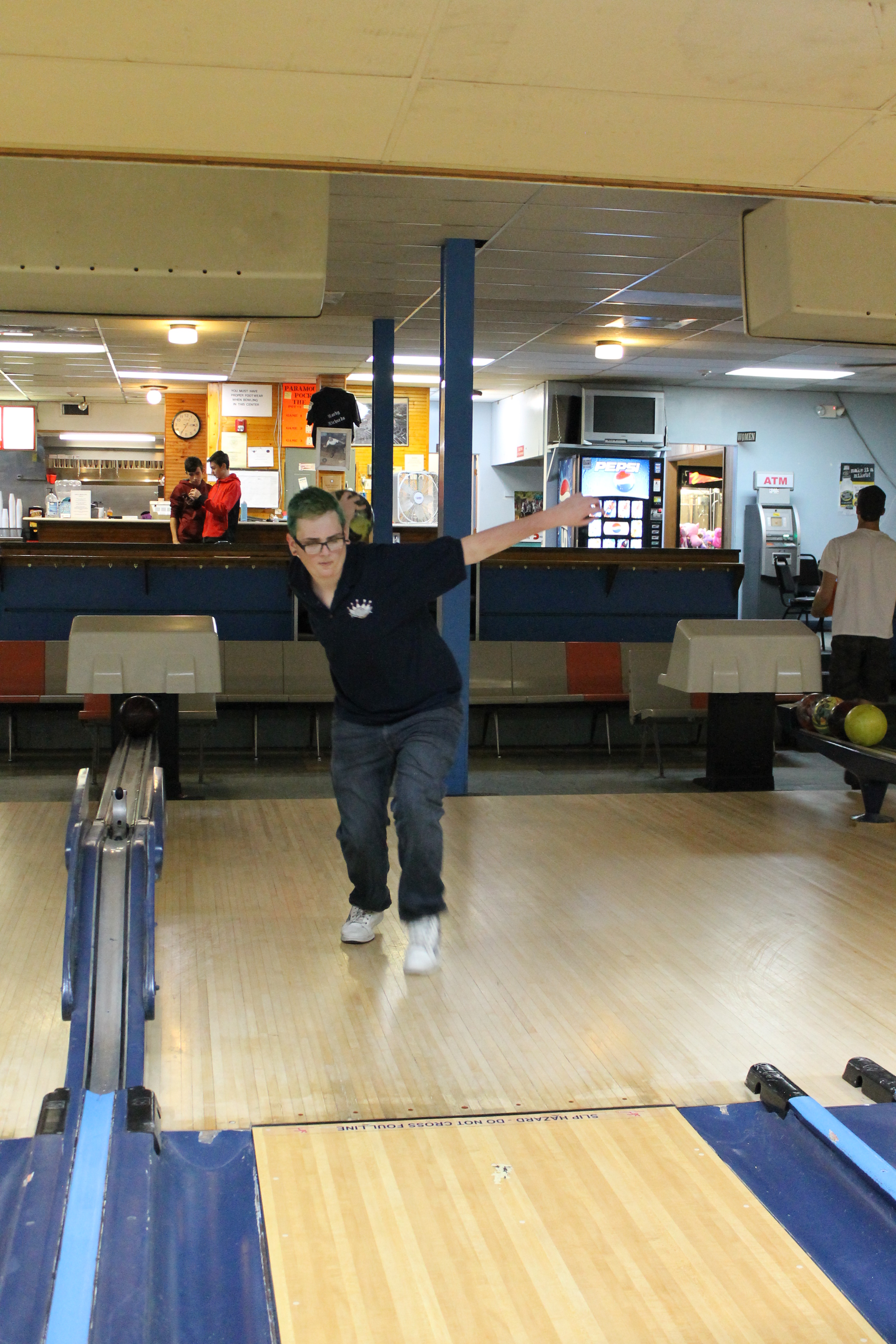 Bowlers meet on their assigned lanes for league and prepare themselves for the 'One Step' drill by getting their bowling shoes on.